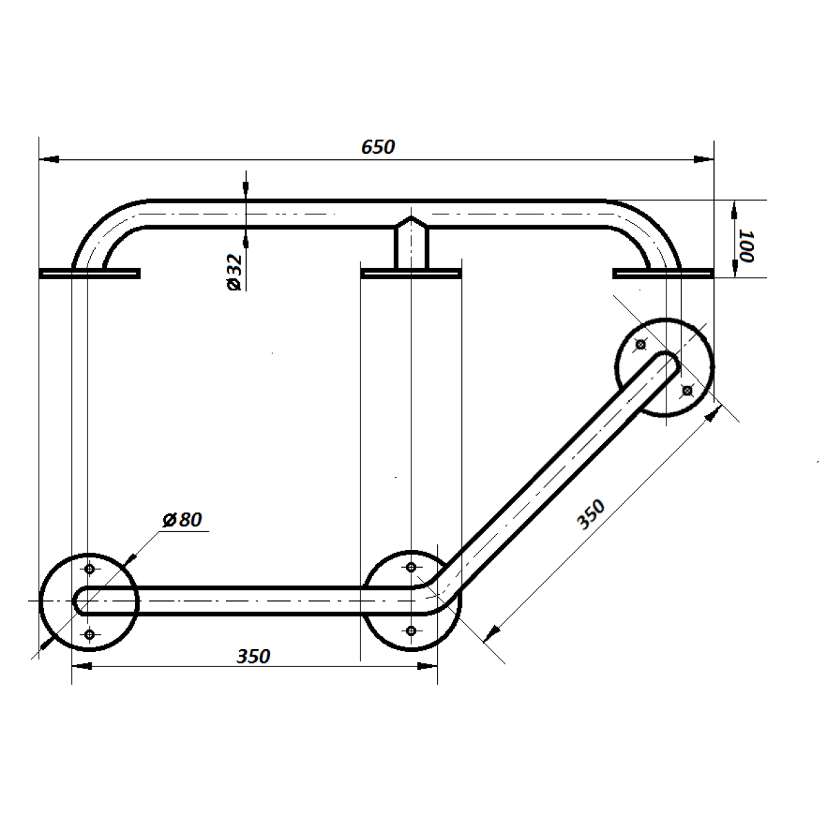 PV-03 Поручень пристінний кутовий посилений, Ø 32мм - 350х350мм